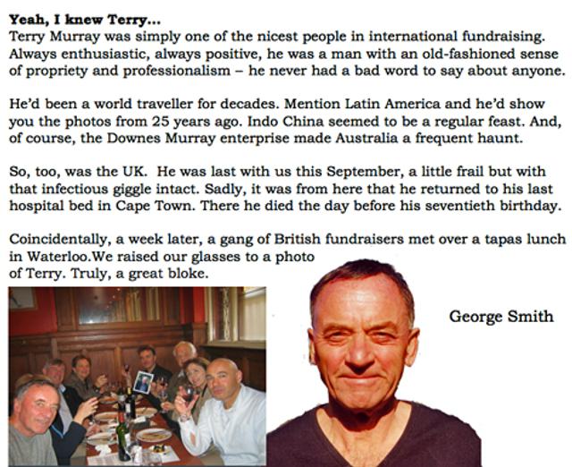 Terry Murray served on the board of the World Fundraising Council, was a founding member, fellow and past vice-president of the Southern Africa Institute of Fundraising (SAIF). He was a member of the faculty team that, through SAIF and the University of South Africa, developed the first ever South African fundraising management course.