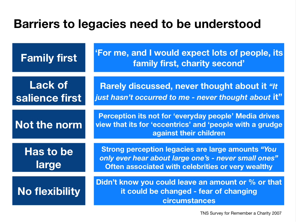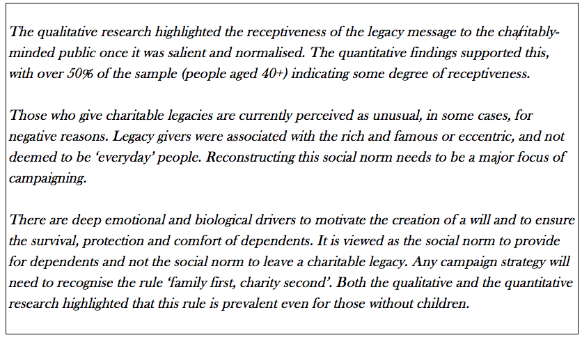 In order to embrace this approach, Remember a Charity sought to identify the barriers, challenges and opportunities for leaving gifts in wills, and commissioned a research study of the will-writing public. This was carried out by TNS (http://www.tnsglobal.com), one of the largest research agencies worldwide, which provides actionable insights to help make impactful decisions. The agency interviewed a large sample of 2000+. They sought to identify the willingness of and barriers to the 40+ audience considering leaving a gift. The final report stated:
