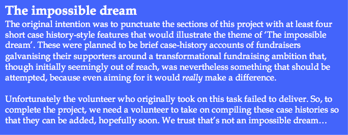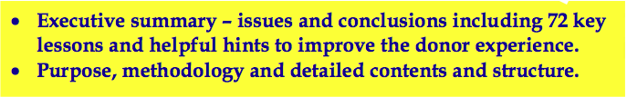 I’ve attempted to distil key lessons from each contributor and present these in the summary as 72 key lessons and helpful hints. Though I’ve done my best to include everything that I feel may be of use to other fundraisers as they explore this subject for themselves, the careful reader will easily find lots more good and useful content among the various sections and contributions.