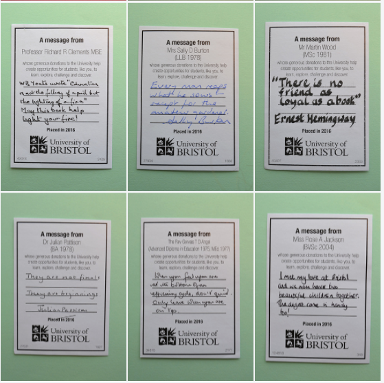 To build on this we wanted to connect them with the Bristol of today whilst at the same time evoking reflections on how being a Bristol graduate had changed their lives and played a significant part in making them the people they have become. So, rather than just asking for support, we asked them to write a message of encouragement or advice to a current student on a bookplate which would be placed in books in the library for hundreds of students to see and be inspired by for years to come.