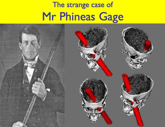 Phineas Gage was clearing rocks for the US railroad in 1848 when dynamite he’d just placed in a hole was accidentally fired. The heavy metal pole he’s seen holding rocketed through his skull leaving a two-inch tunnel diagonally through his head, tearing away his pre-frontal lobe. Amazingly he not only lived, he sat up beside the buggy driver who took him to the nearest doctor, chatting away. More than 100 years passed before scientists realised that Phineas Gage had been living proof that brain and mind are connected but are not single entities. Instead they’re made of several different compartments all with distinct and separate functions. We should know that.