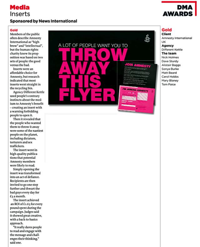 Amnesty International is the world’s leading human rights organisation. The aim of the insert was to acquire regular giving supporters onto the database at an average annual value of £53. The target response rate was 0.044 per cent. The insert was split tested against another test creative in The Guardian and The Observer newspapers. The outer reveal of the pack challenges people to ‘throw away’ the insert – partly a play on the fact that most people like to shake out inserts from their papers and magazines. The first reveal lists the ‘bad guys’, such as rapists and dictators, and challenges the reader to stop reading. The inside copy then gives brief examples of the ‘bad guys’ work’ and asks you to defy them and join Amnesty International.