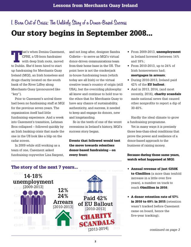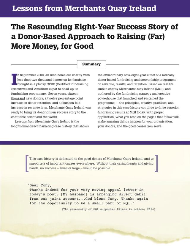 This case study celebrates a success the likes of which even we at SOFII have rarely encountered. Acknowledging their lack of a strong fundraising strategy, in 2008 Merchants Quay Ireland (a charity supporting people experiencing homelessness) turned to three world-class experts for help. During the worst fundraising environment Ireland had ever known, Denisa Casement, Lisa Sargent and Sandra Collette adopted the brave and passionate commitment to put Merchants Quay Ireland’s donors first.