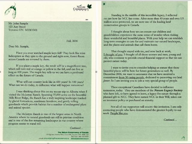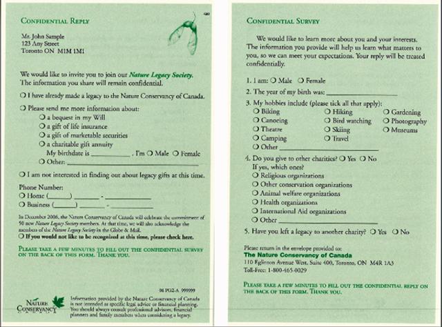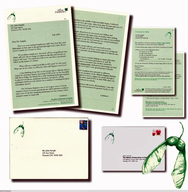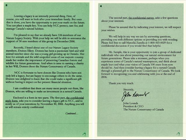 This mailing attempts to find donors who would consider leaving a legacy – particularly, a gift in their will – to Nature Conservancy of Canada (NCC).