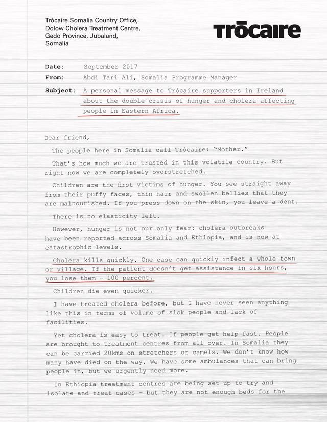 Between Trócaire’s international team based at head office and the Somalia and Ethiopia country teams it was decided that the focus of the September DM campaign story should be around cholera outbreaks in Somalia and Ethiopia. During conversations with Dr Abdi Tari Ali, the Somali programme manager, Abdi referenced how critical the time window for treating cholera was. What moves fast in the Southern Somali desert? A motorised three-wheeled ambulance!. The DM itself featured a particular mother and child who were successfully treated in one of Trócaire’s medical centres in Somalia and talked about more recent outbreaks of acute watery diarrhoea (AWD) in Ethiopia.
