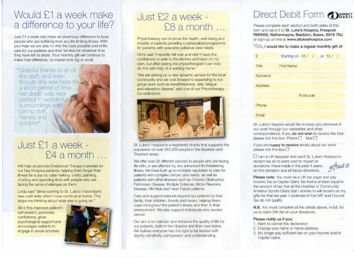 This insert – a simple sheet of A4 with two folds to half A5 – is for a local South Essex hospice with a record of innovative loose inserts. This insert is going for regular giving and its front page (below) makes the point succinctly that continuing care needs continuing support.