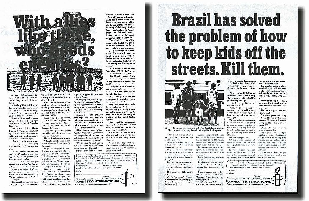 The first advertisement in the series was a half-page test. The headline read ‘Brazil has solved the problem of how to keep kids off the streets. Kill them.’ It brought an immediate result in floods of new members and donations totalling more than the cost of the advert, which was unheard of for acquisition at that time. It also brought condemnation from the Brazilian government and the British Section of Amnesty amazingly agreed not to run the advert again. The killing goes on today – 20 years later.