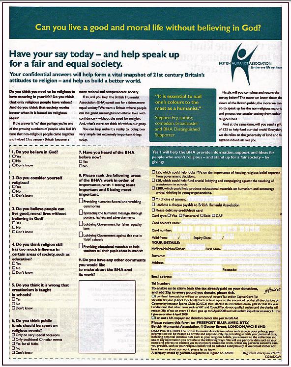 It has an interesting central idea – to combine a questionnaire about readers’ beliefs and attitudes to religion with fundraising. As the body copy says, ‘You can help ...by doing two very simple but extremely important things today.’ The two things are to answer nine questions about belief in God and views about religion, and to give £25 to help BHA’s work.
