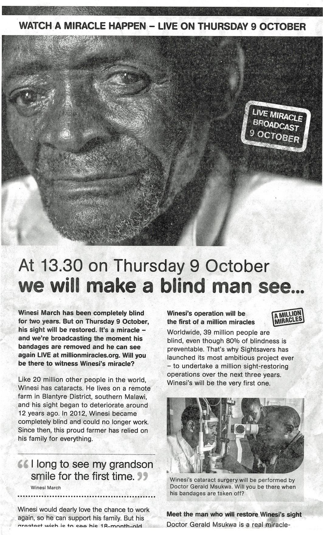 What’s so special about this half-page mono newspaper ad from Sightsavers? Pretty well everything: from the main headline saying that they will make a blind man see at a specific time in a few days time, to the flashes and sub-head (or in this case a super-head) saying that the reader can watch the ‘miracle’ happen live via their website. It’s special because they have humanised the Malawian blind man in question and brought to life what regaining his sight will mean to him. It’s how they have positioned this particular operation as the first of a planned one million such cataract operations, which take only 20 minutes to perform and cost only £30 each, to the personalisation of the doctor who will cary out the operation and remove the patient’s bandages live online. In addtion they have flagged the UK aid scheme by which the government will double any donations and offered a free text reminder to make sure the reader won’t miss the online ‘miracle’.