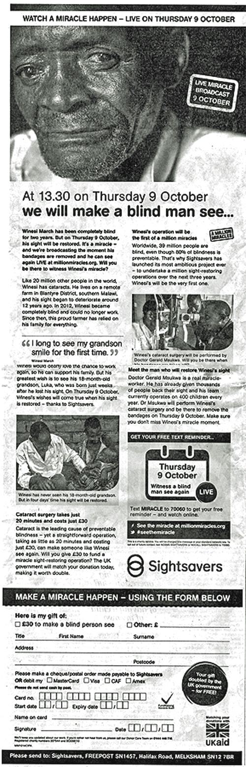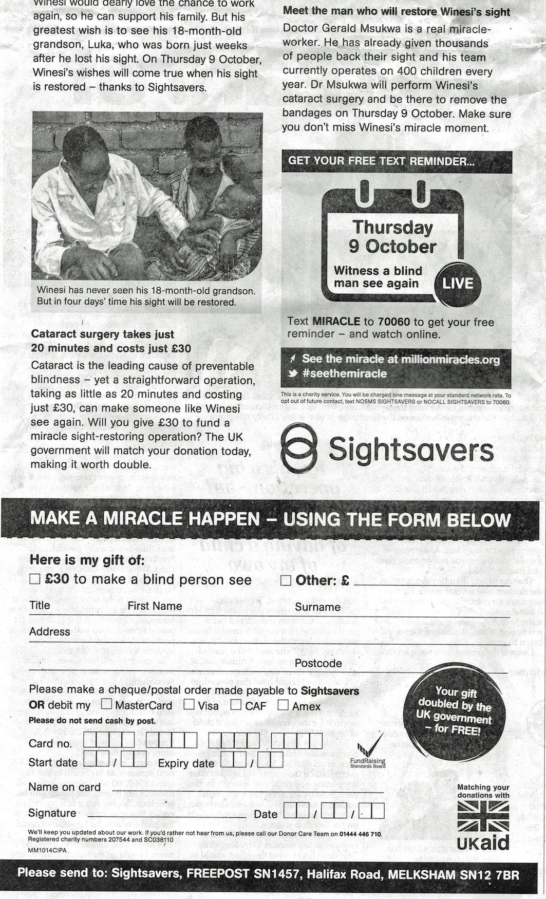 The only slight let down is the sole ask of ‘£30 to make a blind person see’. It cries out for the addition of ‘£60 to make two…’, ‘£90 to make three’, or even “£10 per month to make four blind people per year see again’, or ‘think how many blind perople you could make see again by leaving us a gift in your will... Also it’s a great shame that the only way to donate is by the Freepost coupoon. Why not by phone, text, or online as well?
