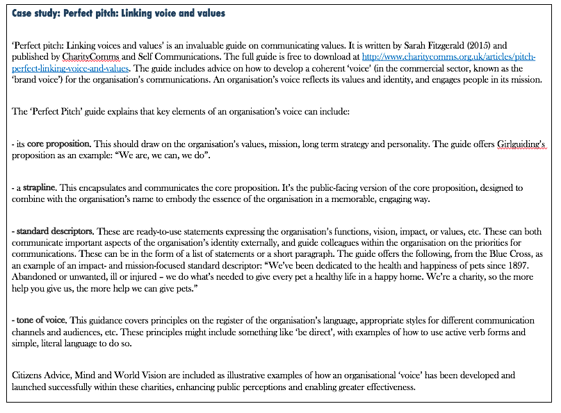 Of course, in order for a supporter to be able to recognise a charity as having shared values, the charity must have and express some values in the first place. A study by Sargeant and Woodliffe found that “the extent to which individuals believe that they have deepened their knowledge of the organisation thought the communications they receive” will “impact positively” on the individual’s relationship with the organisation. [4] The Relationship Fundraising review proposes that supporters’ trust in and loyalty to a charity “may be enhanced by […] making it clear what values the organisation espouses, […] communicating not only the content of service provision to beneficiaries, but also the style, manner or ethos underpinning that delivery.” [5] This suggests that supporters will feel more positively towards a charity, and feel more satisfied by its communications, if the charity clearly communicates its values, ethos and identity. This may in part be because this allows charities to better manage, and therefore better meet, supporters’ expectations. [6]