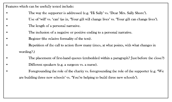 Comparing the effectiveness of versions in which features like these are varied will show you how you can make language work best for your message and your cause. These tests are immeasurably more valuable than simply testing one version against a control text. The kinds of insights these tests give you, about subtle but crucial differences in effectiveness, can reveal many ways of enhancing current and future communications exponentially. Going beyond the ‘control copy vs. version b’ lets you find out what really works best in your charity and for your supporters.