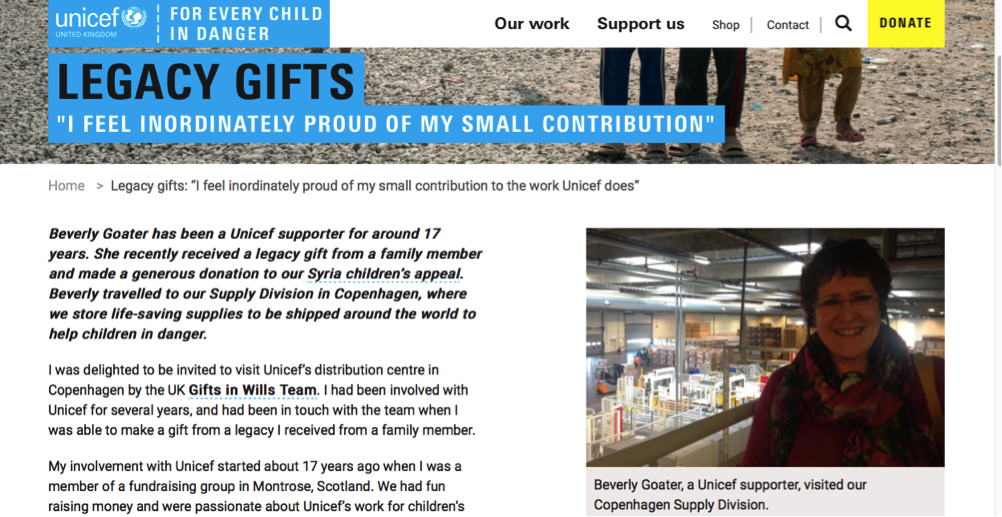 As part of the new strategy to inspire and engage both new and existing supporters, UNICEF spoke to several of its closest legacy supporters who shared their own stories to encourage conversations amongst peers and supporters. Personal experiences with the charity and motivations to consider a gift in their wills were then used to support the legacy programme, encouraging and inspiring others to do the same, each helping UNICEF to achieve its aim of creating a safer world for children. Similarly, blog posts written by supporters were placed on the website pages and were used to ensure that new visitors to the site were met with accessible content. In effect, UNICEF was ‘social norming’ its website.