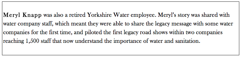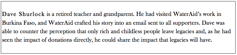 With regard to the telephone campaign script, WaterAid tested the sharing of both Dave and Meryl’s stories to see if gender had any uplift on people requesting a legacy pack. They also became community volunteers to promote legacies during their talks.