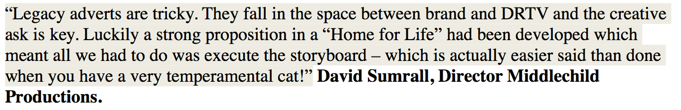 Home for life is an example of a legacy DRTV advert. The pay back for legacy DRTV is over a longer period. This advert offers a simple premise of looking after your pets after you have gone.