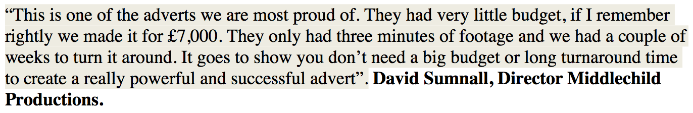 This was a successful advert for the RSPCA. It portrays the problem clearly and honesty and has a clear and simple call to action. The urgency is laid out at the start. There is strong eye contact from the animals, and the solution is clearly shown. None of the footage is contrived. This is a good example of a DRTV advert which presents the need and solution in an honest manner.