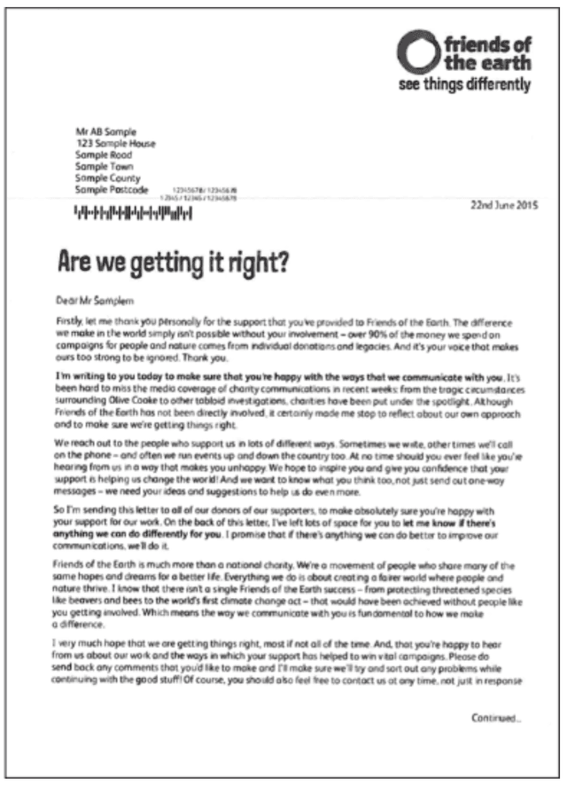The media storm that blew up after the death of Olive Cooke, wrongly alleged to have been hounded to committing suicide by charity communications, prompted Friends of the Earth to hold internal discussions as to how they should respond, even though they weren’t named as one of the offending organisations. They decided to get in touch with their supporters by email and letter to acknowledge the negative coverage, ask for feedback on the supporters’ experience of Friends of the Earth communications and offer them a chance to comment freely on the charity’s practices.
