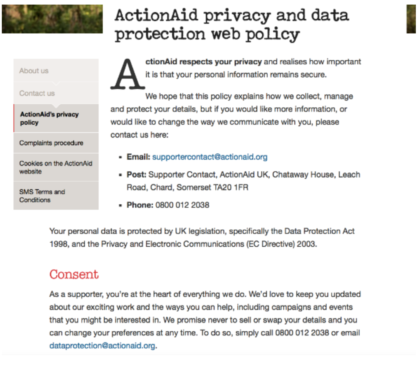 ActionAid have a jargon free data protection web policy and make it easy for supporters to contact them to update their preferences.