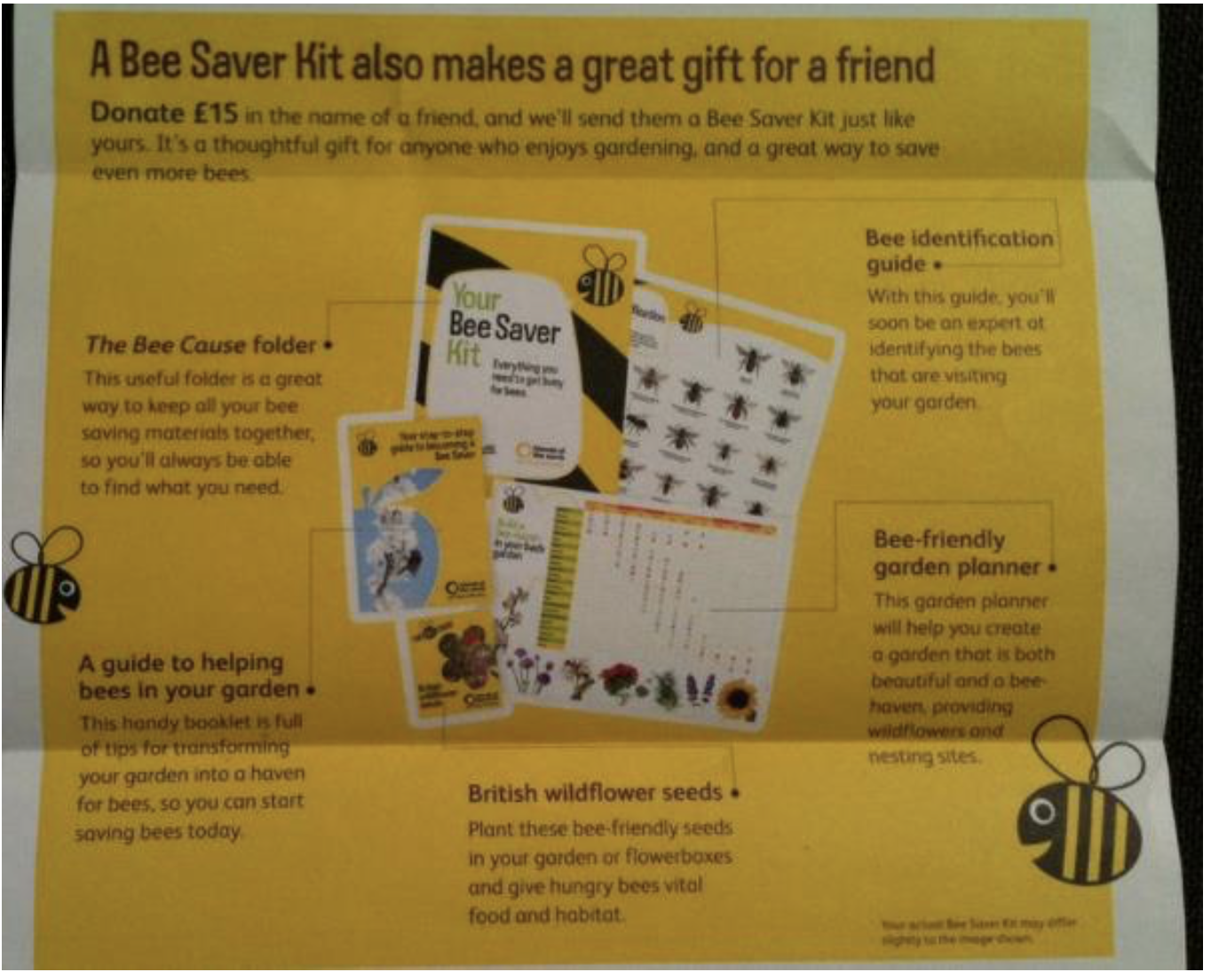 The Friends of the Earth ‘Bee Cause’ campaign offered donors the chance to receive a ‘Bee Saver Kit’ in return for a gift of £15: