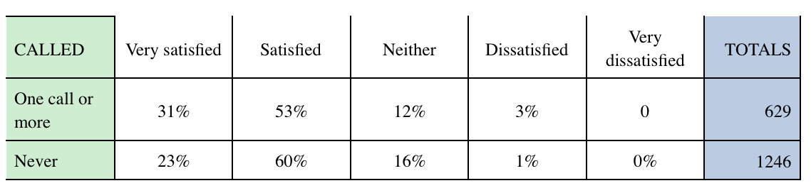 Called people were 35% more likely to tick very satisfied than those not-called and called people were 25% less likely to tick neither than non-called.