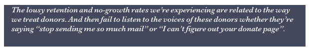 Perhaps “listening”, too, feels a little soft for our target-riddled, Excel-driven fundraising culture. But, as Roger Craver pointed out on Fundraising 101, we’ve all paid the price for ignoring donors in recent years: