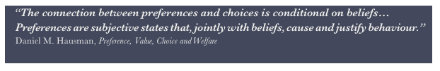 This is because a preference, as economist Daniel Hausman explains in Preference, Value, Choice and Welfare, is comparative: “To prefer something is always to prefer it to something else… preferences require that one weigh alternatives.”