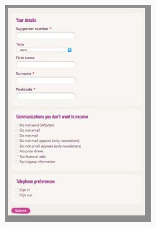 The options are offered on the website, via email, and on phone calls as well as on printed communications including administration letters. Once made they can easily be amended again on an ongoing basis. Since the majority of supporters receive emails, it has been easy to offer these choices to the whole database of 140,000 people.