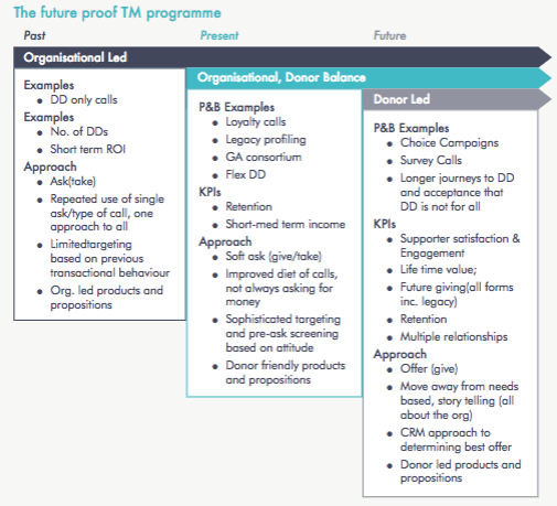 Pell and Bales mapped out a possible journey from the past, organisation-led approach; through the present, which balances the needs of the organisation with those of the donor, to a future, more donor-led approach; and looked at the creative approach behind a more donor-led call.