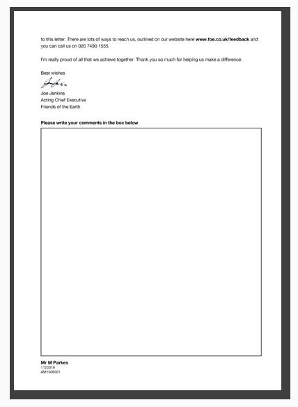 A letter went out from Joe Jenkins, Acting Chief Executive, to every single Friends of the Earth supporter. It set out clearly how much supporters are valued as the partners without whom none of the charity’s vital work could happen; showed appreciation and gratitude for all that they help to achieve; laid out the shared values that bring supporters together with the charity; acknowledged the situation in the press; and asked whether the supporter was happy with the ways that charity communicates with them.