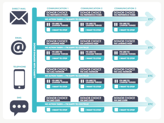 The scale and type of options are up to the charity but all must be practical, manageable and sustainable, all must offer donors the chance to increase, reduce or cease completely what they receive. In each communication donors should be given simple, easy-to-make choices and be invited to telephone or email the fundraising office if they have any issues or questions.