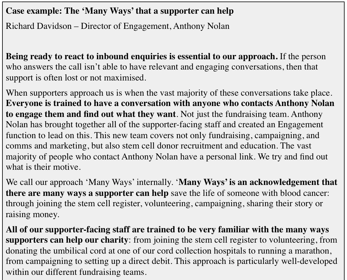 Questions to ask: Have you mapped out the ‘many ways’ your supporters could help you? Is everyone who takes an inbound enquiry able to deal with that first conversation?