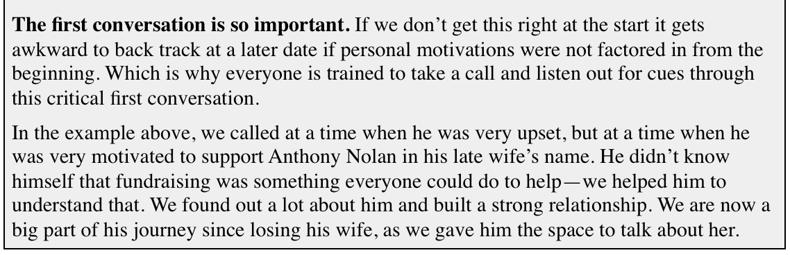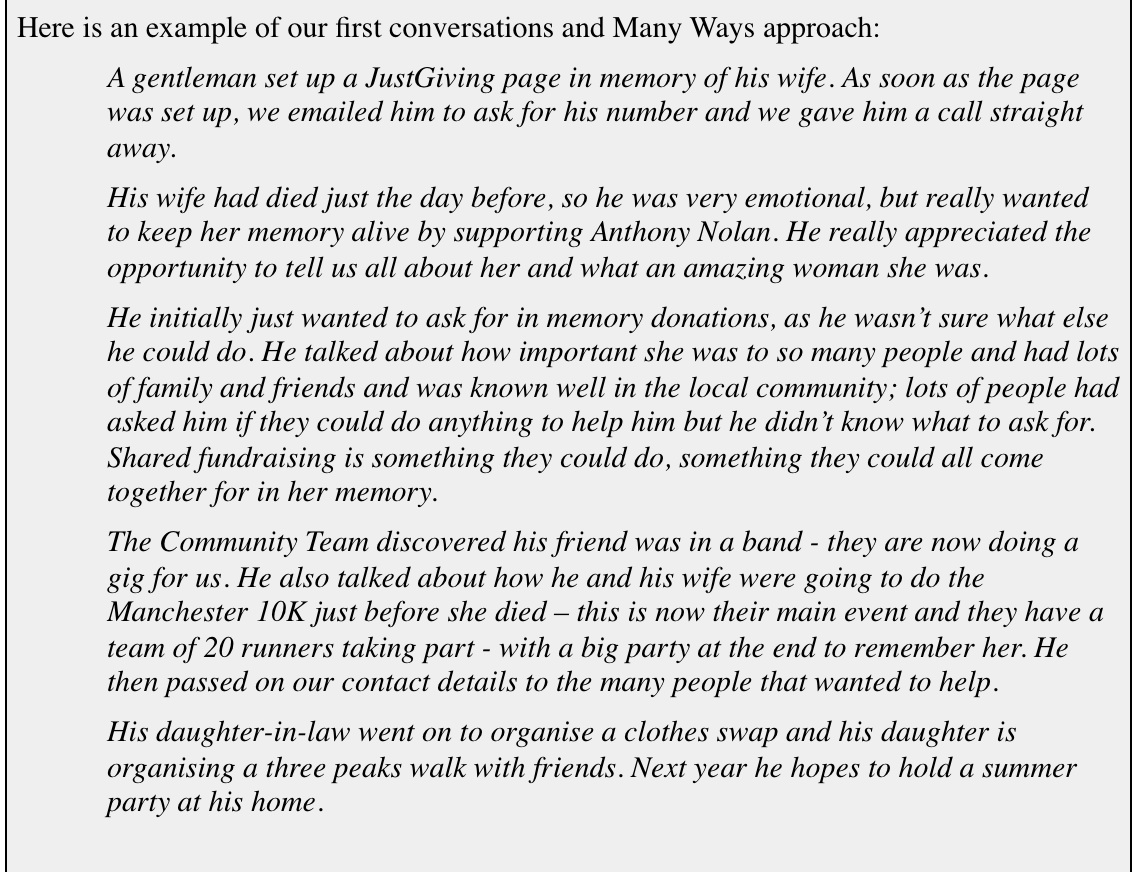 The community fundraising team at Anthony Nolan meet first thing at 9:30 am every morning, and then again at 2:30 pm in the afternoon, to look at inbound emails they have received about new enquiries or offers to fundraise from individuals. Their aim is to respond within two hours of receiving an email and to speak to people as soon as possible (see the case example in Action 6).
