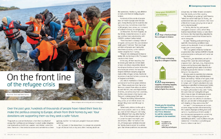 The piece included details of CAFOD’s work on the frontline of the migration crisis, talking to volunteers about working with the charity’s partners on the ground with desperate people arriving on the shores of the Greek island of Lesbos last year. It included details about the £2 cost of a food package for a refugee in Greece, £15 for a sleeping bag and £22 for a package of emergency supplies for a baby.