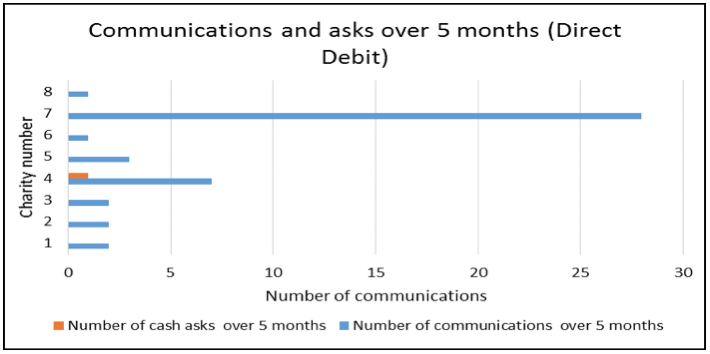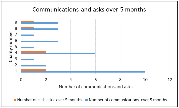 Again, the results varied in the number of communications that were received, with the majority of charities communicating very little, although one sent 28 emails over the five-month period.