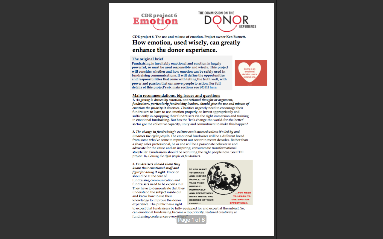 For those keen to master emotional fundraising this project has six sections to help you to access all the content in CDE project 6, the use and misuse of emotion. To appreciate the foundations on which this summary’s conclusions are based please study all six sections, here. If your time is limited focus just on this summary, the introduction and section 6 (which also includes the points in this summary, slightly expanded and ordered differently).