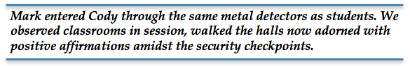 Mark entered Cody through the same metal detectors as students. We observed classrooms in session, walked the halls now adorned with positive affirmations amidst the security checkpoints. The tour ended in a non-descript conference room. There, four principals told the story of new Cody. They told their personal stories of being raised in the inner-city with the odds stacked against them and how education was their saving grace. Working with Cody students facing the same or worse plight compels them to work 14+ hour days, give students their personal cell phone numbers and encourage them to reach out day or night.