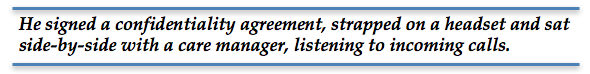 The first tour stop was our 211 call centre, where we received more than 400,000 calls for basic needs assistance annually. He signed a confidentiality agreement, strapped on a headset and sat side-by-side with a care manager, listening to incoming calls.