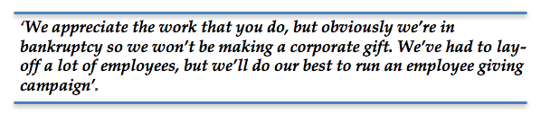 ‘We appreciate the work that you do, but obviously we’re in bankruptcy so we won’t be making a corporate gift. We’ve had to lay-off a lot of employees, but we’ll do our best to run an employee giving campaign’.