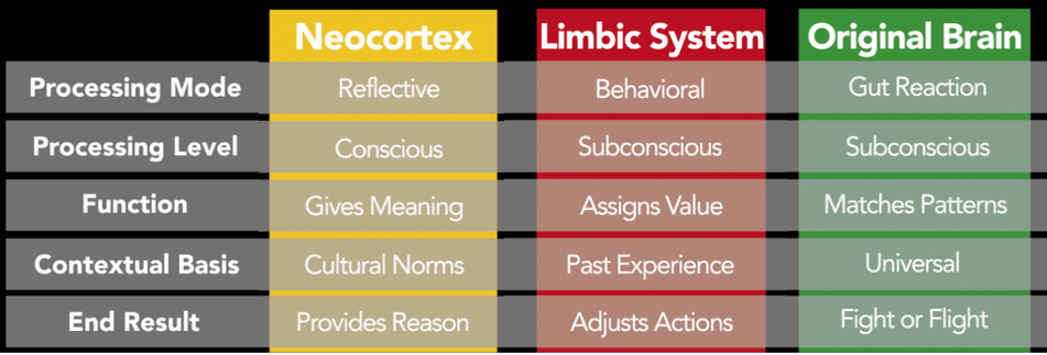 Nobel Prize winner, Daniel Khaneman [3]said that ninety-five percent of what we think happens at an unconscious level and sensory impressions and their emotional responses are anchored in some parts of the brain whose origins date back hundreds of millions of years. The sensory brain (also called the reptilian or lizard brain) and the emotional brain (mammalian) work together. The rational brain (or that of the human) is considerably more recent, in evolutionary terms since it has developed about 100,000 years ago.