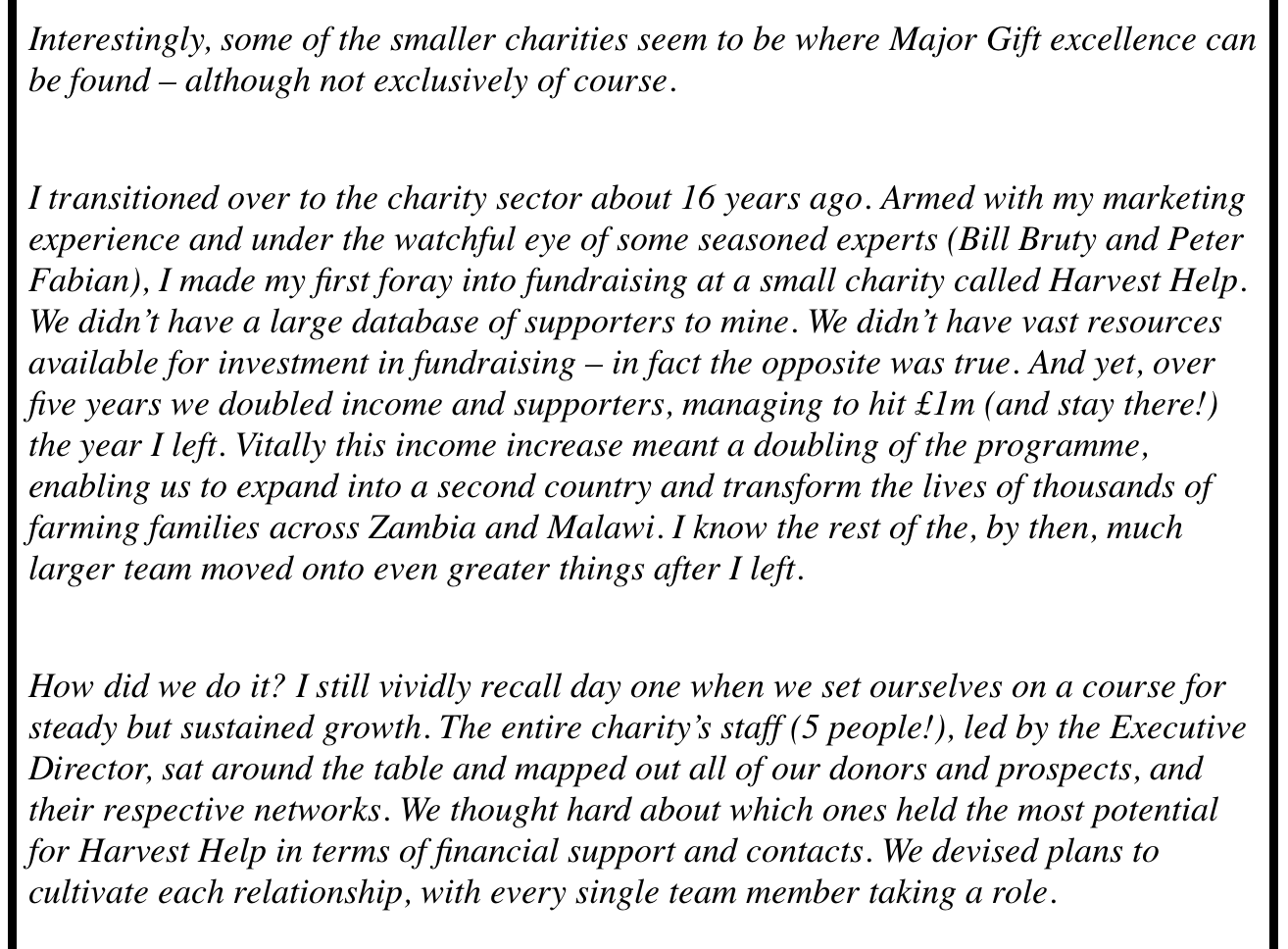 In summary, the donor experience can go badly wrong if donor and organisational needs are mismatched. If you don’t want involvement alongside money, then major donor fundraising may be the wrong choice for you. In short only choose major donor fundraising if you are prepared to meet the needs and interests of major donors.