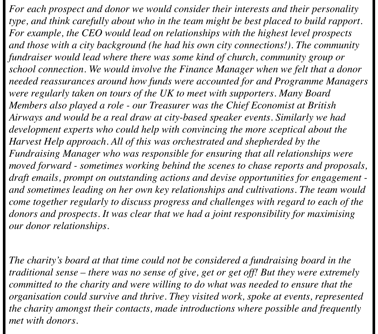 Below are three extracts from Case Studies in the 2015 Coutts Million Dollar Donor Report for the UK[19]. Each of these underlines the idea that major donors do not want to simply write cheques. Rather, they see themselves as partners in achieving a shared mission: providing financial resources but also having hands on involvement.