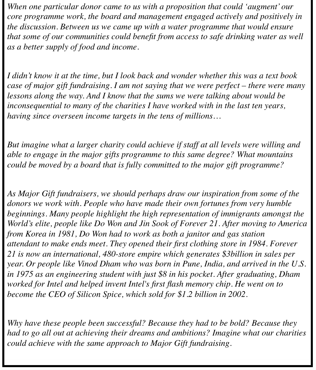 Perhaps the ultimate litmus test of whether major donor fundraising is right for your organisation is whether you want and are able to successfully build a fundraising or development board: a group of individual donors and supporters who commit to raising a specific sum of money, often for a particular purpose, in a given timeframe. Such senior volunteer fundraisers really do see themselves as partners of the organisation and its leadership to deliver a special and often transformational result.