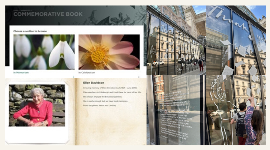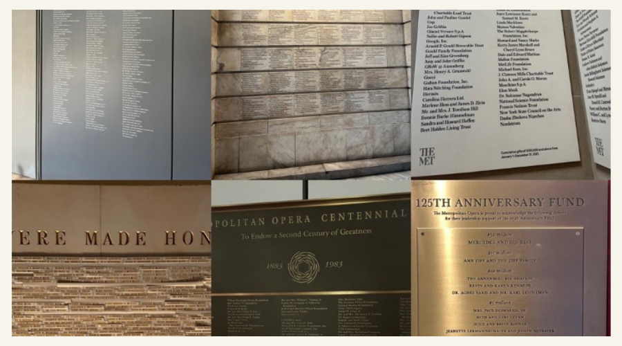 The other example is the front of the Royal Opera House in London. There was a big campaign during the COVID-19 pandemic to keep the opera house going. They showcased donors here who gave gifts large and small. While traditionally they might have a more hierarchical way of showcasing their donors, this was a beautiful etching of every name in the same size, recognising every single gift on the glass windows.