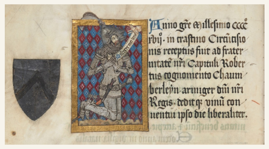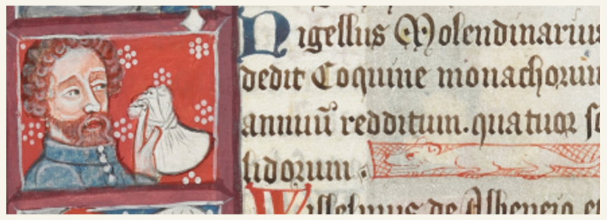 Nigel was a miller in the 14th century and every year he gave a gift of four shillings. You can see his illuminated portrait above, that shows him making his donation.