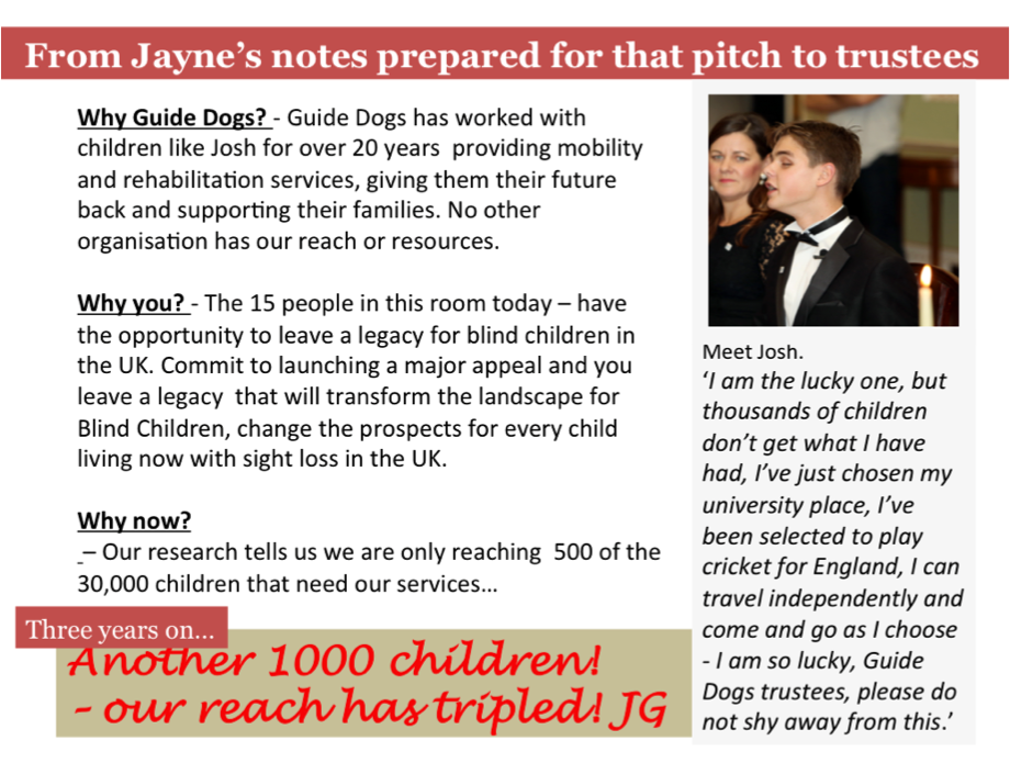 ‘Nowadays,’ Jayne explains, ‘the Guide Dogs message is more complex and has to be focused less on the dogs – we’re not an animal charity, we’re about combating loneliness and isolation for people. Just one of the ways we do that is by providing beautiful, brilliant, superbly trained and life-changing companions, the guide dogs. Guide dogs are working dogs. They’re heroes. Sponsor a puppy is still our flagship product. But we’re more than that. We have access to many powerful inspirational stories. So I decided to use emotional fundraising as a catalyst to change the perception of Guide Dogs – so that everyone in the whole organisation would at any time, anywhere, be able to talk about the impact of our work with integrity, passion and authenticity.