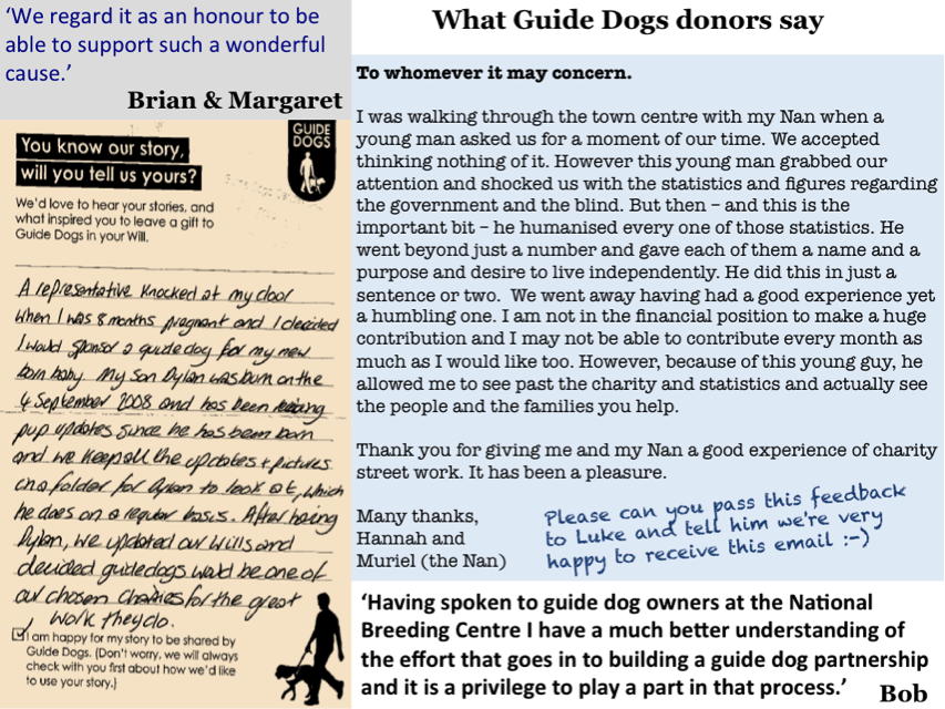 ‘I prepared the ground quickly after joining by making changes in the core team right from the start. As time has gone by it’s got easier and easier and now everyone buys in to the training, in fact they queue up for it. Everyone knows what emotional fundraising means and gets it. We all get the need for simplicity, what our donors, our audiences’ need, the truth told well, what interests people, how personal accounts matter and how we want to make people feel. The key is that it’s real. And we’re lucky in this because we get the most amazing real stories in letters from dog owners or from families. It’s an emotional place, Guide Dogs.