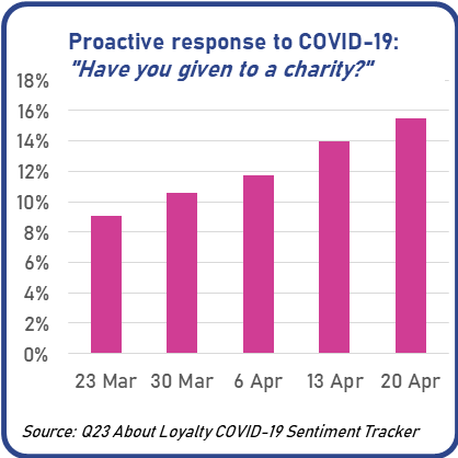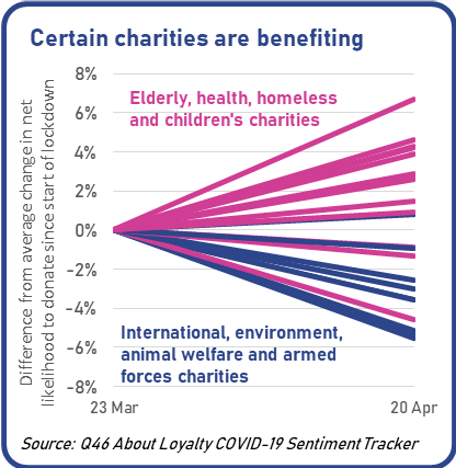 Net trust in charities is high and sustained at around 41 per cent for the full five weeks from lockdown to 23rd April. And in terms of reported behaviour, the proportion of people who have given to a charity as a response to coronavirus has increased by over 70 per cent.