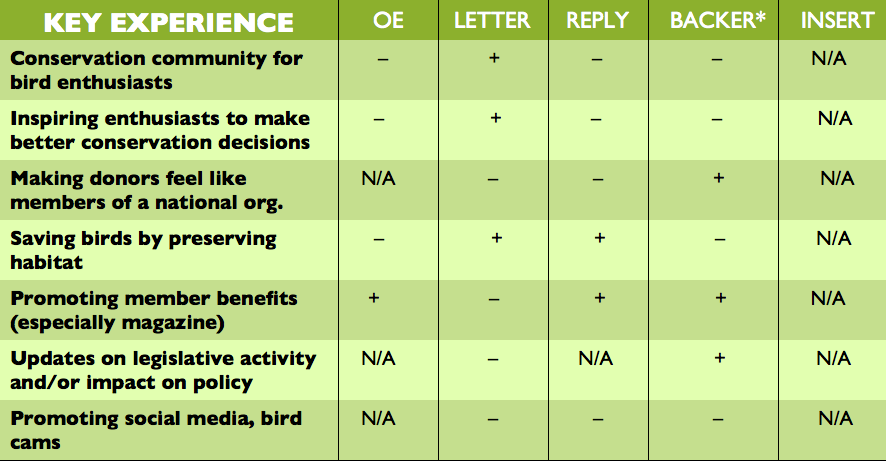 In this scorecard we’re evaluating a mail pack, but it could be anything. It’s not there to evaluate storytelling, design, layout, etc. Simply relevance. Each component of the pack is listed: envelope, letter, reply form, etc. All we need to do is tick or cross whether each piece of the pack is doing its job. So here we can see that three quarters of the message that needs to be got across on the outer envelope isn’t there. Why would anyone open it? If they did open it, more than half the message that needs to be delivered in the letter isn’t there, but plenty that shouldn’t be there is.