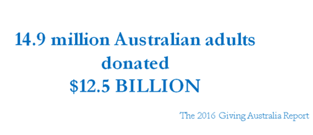 The 2016 Giving Australia Report told us that an estimated 14.9 million Australian adults gave a total of $12.5 billion to charities and nonprofit organisations.