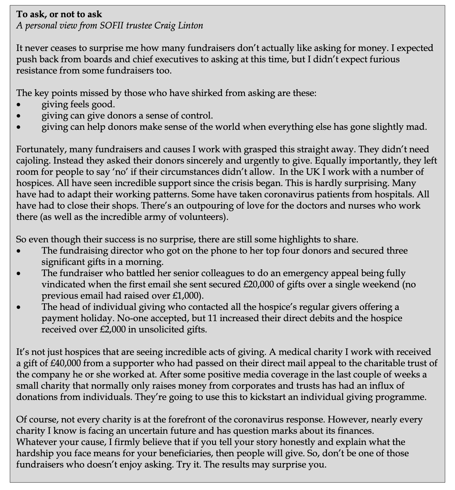 SOFII is pleased to bring you a series of examples of how fundraisers the world over are fundraising effectively in this time of crisis.